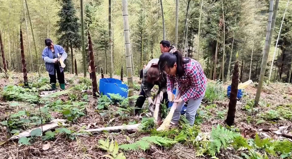 眼下正值春笋采挖季节,在湖南省桃江县鸬鹚渡镇长江村,300亩的笋竹两用林基地内,村民们正在采挖新鲜的春笋。