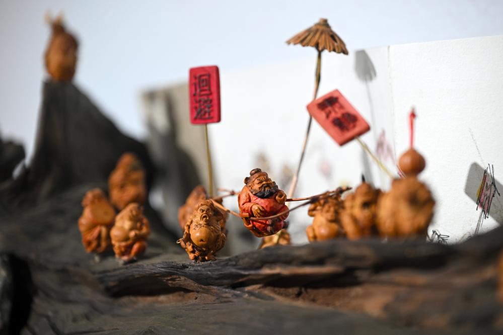 这是展出的残疾人核雕作品《钟馗夜巡》(4月16日摄)。