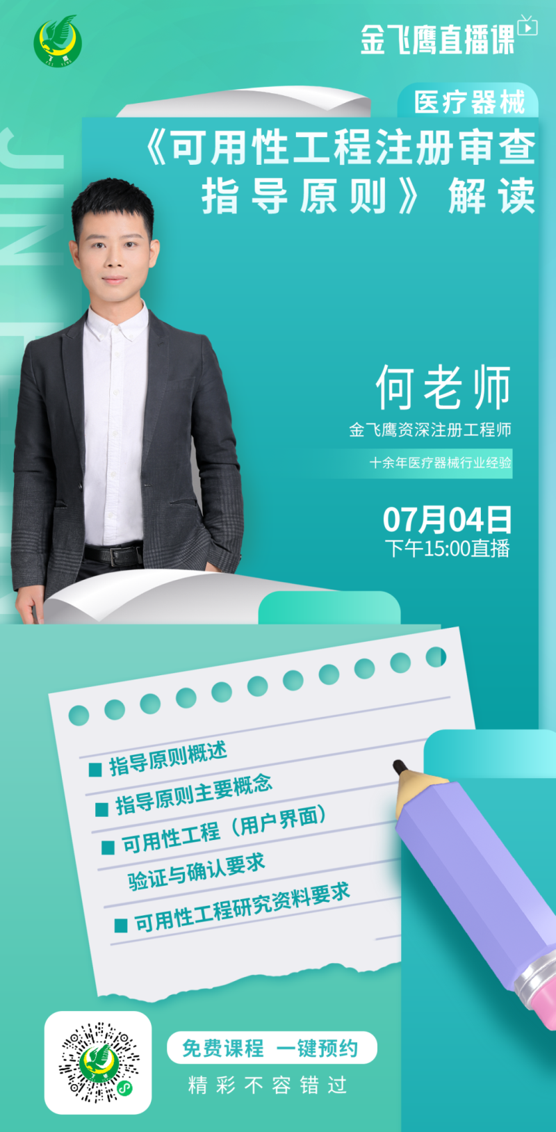 金飛鷹直播培訓(xùn),是每周一次的固定培訓(xùn)欄目,優(yōu)選金飛鷹國內(nèi)外資深注冊/項目老師定期為大家講解醫(yī)療器械注冊相關(guān)知識,解答大家在醫(yī)療器械注冊過程中的諸多疑問。