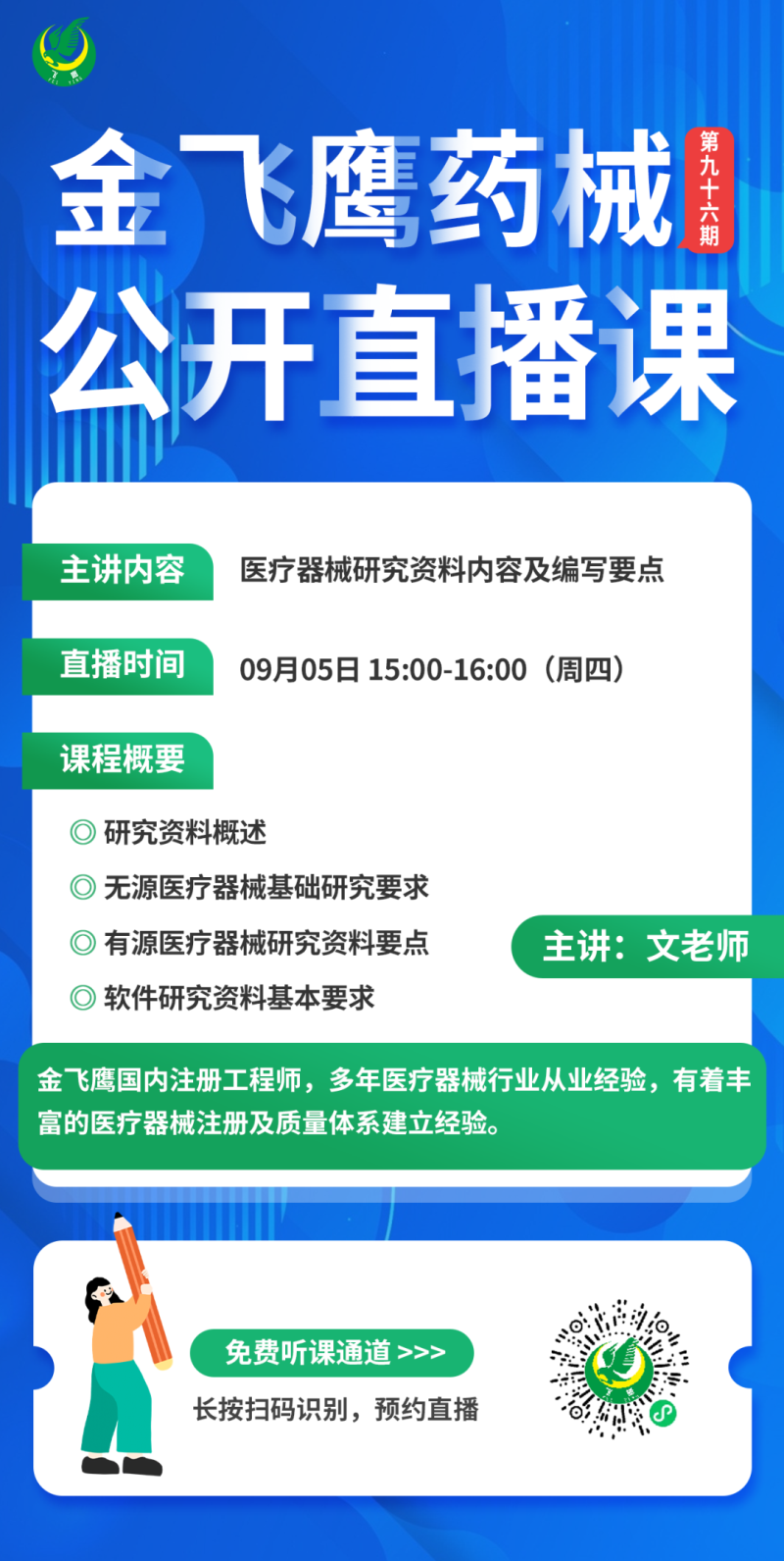 9月5日下午3點(diǎn),金飛鷹國(guó)內(nèi)注冊(cè)工程師,有著豐富的醫(yī)療器械注冊(cè)及質(zhì)量體系建立經(jīng)驗(yàn)的文老師,給大家?guī)?lái)《醫(yī)療器械注冊(cè)入門知識(shí)分享-研究資料內(nèi)容及編寫要點(diǎn)》,培訓(xùn)內(nèi)容包括研究資料概述、無(wú)源醫(yī)療器械基礎(chǔ)研究要求、有源醫(yī)療器械研究資料要點(diǎn)、軟件研究資料基本要求,大家千萬(wàn)不要錯(cuò)過(guò)了!