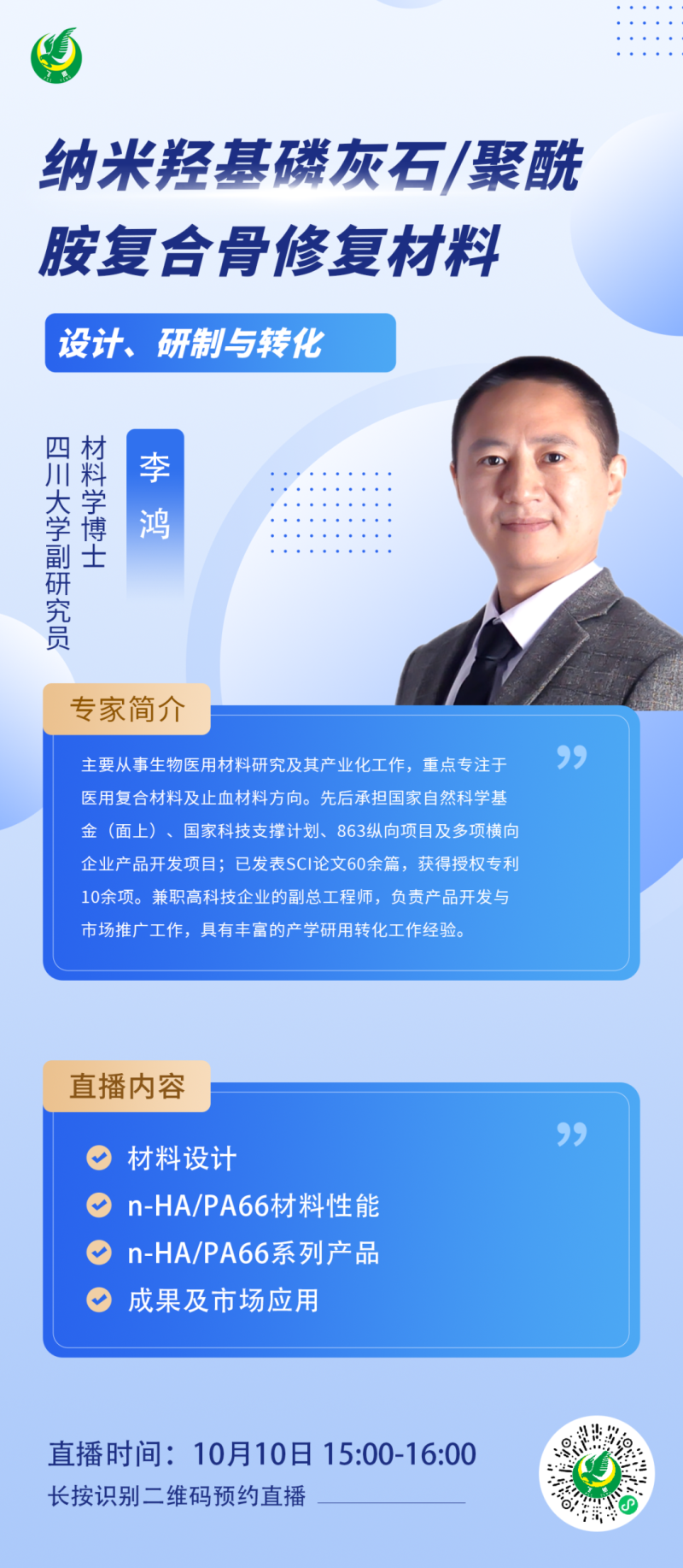 10月10日下午3點,李老師給大家?guī)?/span>《納米羥基磷灰石/聚酰胺復(fù)合骨修復(fù)材料的設(shè)計、研制與轉(zhuǎn)化》,將從材料設(shè)計、材料性能、研究成果及市場應(yīng)用等方面給大家詳細介紹,對此類高分子材料感興趣的朋友千萬不要錯過了哦~