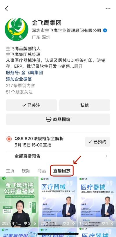 往期直播培訓(xùn)課程支持回放,關(guān)注“金飛鷹藥械咨詢(xún)服務(wù)”視頻號(hào)并點(diǎn)擊視頻號(hào)主頁(yè),即可查看“直播回放”哦~