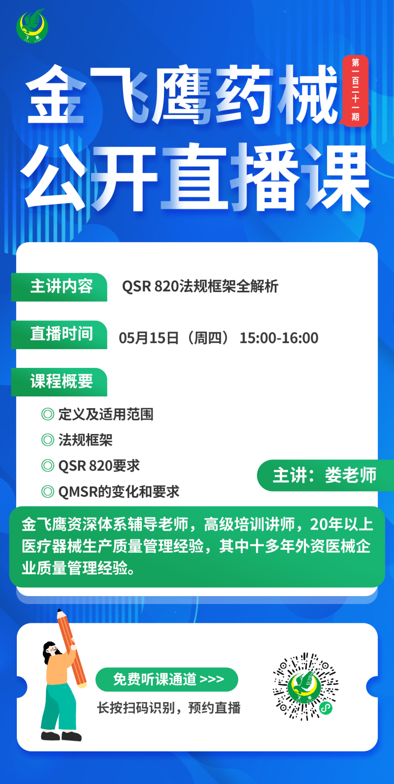5月15日下午3點(diǎn),金飛鷹資深體系輔導(dǎo)老師、有著十多年外資醫(yī)械企業(yè)質(zhì)量管理經(jīng)驗(yàn)的婁老師給大家?guī)?lái)《QSR 820法規(guī)框架全解析》,他將從基本概念和基本要求兩部分出發(fā),幫助相關(guān)企業(yè)深入理解QSR 820法規(guī)框架,在此基礎(chǔ)上建立起符合法規(guī)需求的QSR 820體系。接下來(lái)我們還會(huì)在另一期直播課中深入講解FDA現(xiàn)場(chǎng)檢查應(yīng)對(duì)策略,感興趣的朋友記得持續(xù)關(guān)注哦~