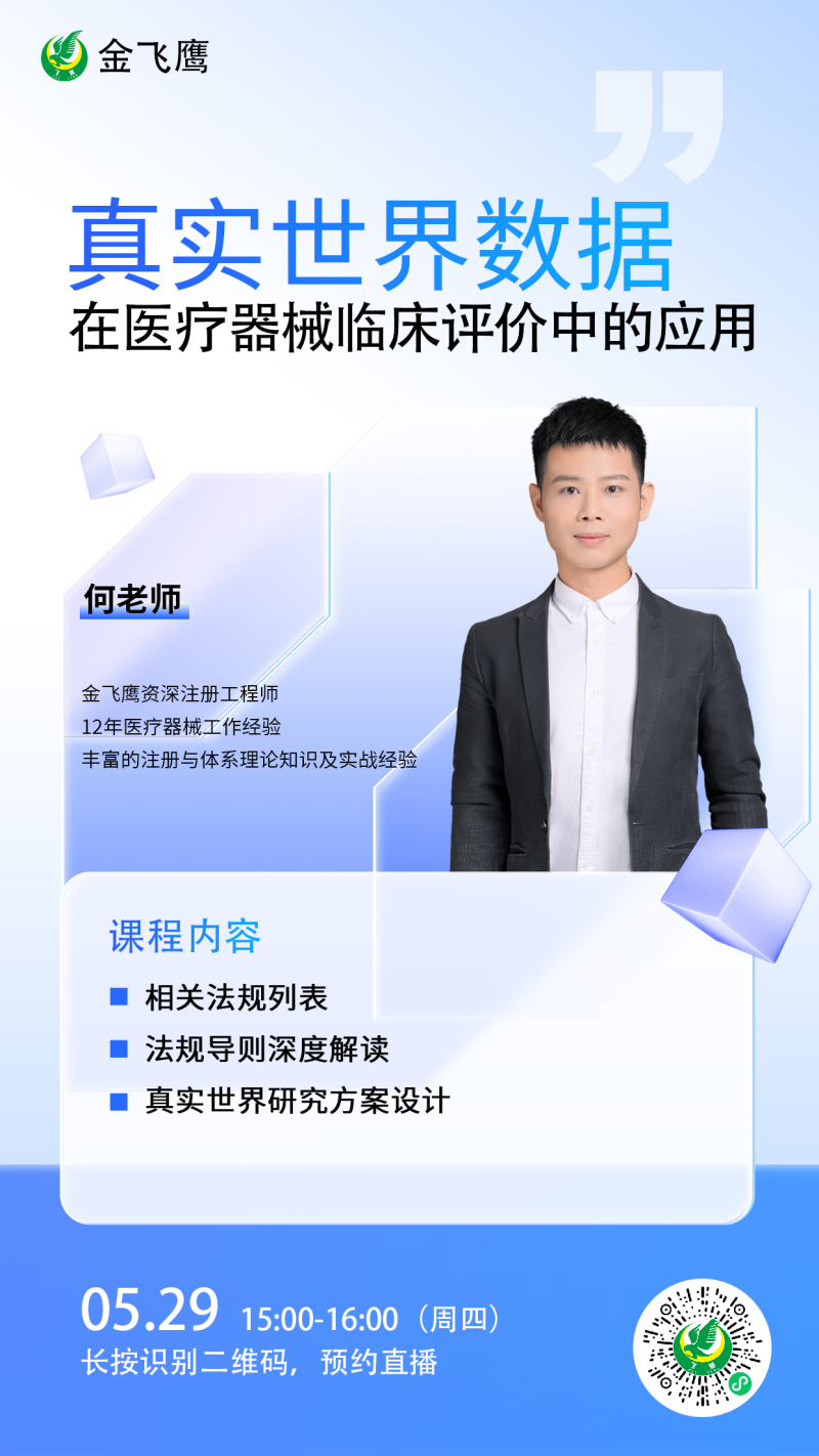 5月29日下午3點(diǎn),金飛鷹資深注冊工程師、有著12年醫(yī)療器械行業(yè)從業(yè)經(jīng)驗(yàn)的何老師給大家?guī)怼墩鎸?shí)世界數(shù)據(jù)在醫(yī)療器械臨床評價中的應(yīng)用》,他將立足法規(guī)要求,結(jié)合實(shí)戰(zhàn)案例,重點(diǎn)解析真實(shí)世界研究方案設(shè)計(jì)要點(diǎn),為企業(yè)高效開展真實(shí)世界數(shù)據(jù)應(yīng)用提供專業(yè)指導(dǎo)。