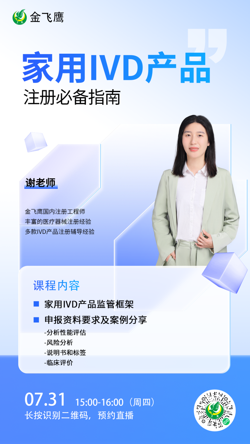 7月31日下午3點,金飛鷹國內(nèi)注冊工程師、有著多款I(lǐng)VD產(chǎn)品注冊輔導(dǎo)經(jīng)驗的謝老師給大家?guī)怼都矣肐VD產(chǎn)品注冊必備指南》,她將結(jié)合具體案例,拆解分析性能評估(如何確保性能不會受到非專業(yè)檢測環(huán)境的明顯影響)、說明書標(biāo)簽設(shè)計(防誤操作警示標(biāo)識設(shè)置)等關(guān)鍵環(huán)節(jié),手把手指導(dǎo)企業(yè)規(guī)避高頻發(fā)補風(fēng)險。這場培訓(xùn)將為您揭開家用IVD注冊的“隱形門檻”,助力產(chǎn)品快速獲批、搶占市場先機,感興趣的朋友記得提前預(yù)約!