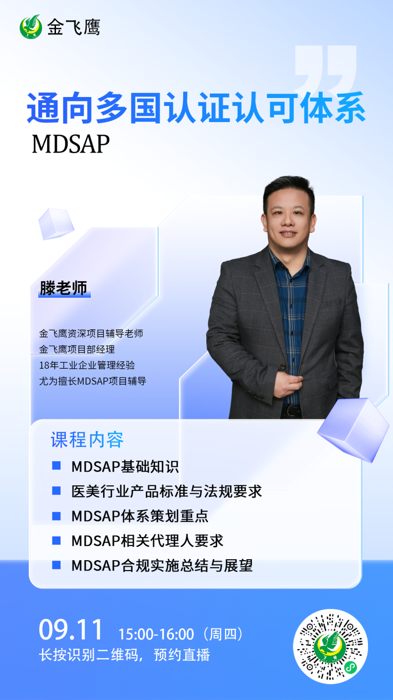 9月11日下午3點(diǎn),金飛鷹高級(jí)項(xiàng)目咨詢師、有著諸多MDSAP項(xiàng)目輔導(dǎo)經(jīng)驗(yàn)的滕老師,給大家深入淺出地講解MDSAP審核的核心邏輯與應(yīng)對(duì)技巧,讓您不僅“知其然”,更“知其所以然”!感興趣的朋友記得提前預(yù)約,鎖定這場(chǎng)合規(guī)必修課!