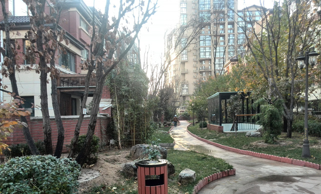 小區(qū)內(nèi)干凈、整潔,綠樹成蔭,但由于小區(qū)的體量較小,綠化、水系等景觀設(shè)計(jì)等均讓人感覺略顯局促。