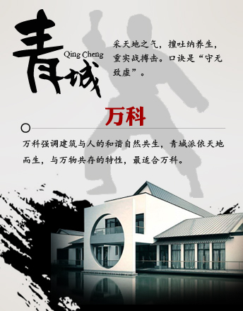 萬科 青城派 青城派擅長吐納養(yǎng)生,注重實戰(zhàn)搏擊。 萬科始終以穩(wěn)健規(guī)范的經(jīng)營作風(fēng)著稱。強調(diào)建筑與人的和諧自然共生,青城派與自然萬物共存的特性,最適合萬科不過。