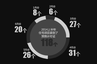 2014年上半年,共有118個住宅項目拿到了預(yù)售許可證。批準(zhǔn)銷售總套數(shù)為38363套,已銷售套數(shù)為11146套。其整體月均去化率為13.64%。