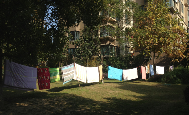 同時(shí),記者還看到,不少業(yè)主將繩子綁在小區(qū)樓宇空地間的大樹(shù)上,然后晾掛起棉被和衣物,如此做法讓小區(qū)看上去極不美觀。