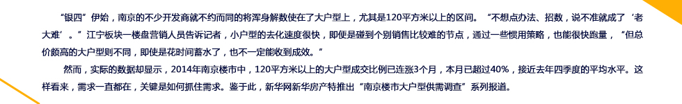 據(jù)黃媛分析,大戶型的熱銷主要原因有二。一是片區(qū)規(guī)劃的利好,周邊配套逐步成熟,吸引了主城區(qū)的客戶。而是其他片區(qū)單價(jià)昂貴,直接導(dǎo)致大戶型總價(jià)“離譜”,若想在南京改善居住品質(zhì),那么只有選擇還處于價(jià)格洼地的江北。黃媛認(rèn)為300萬是個(gè)臨界點(diǎn),如果大戶型總價(jià)在300萬以內(nèi),購房者是可以接受的,但如果超過300萬,開發(fā)商就會(huì)比較頭疼房子怎樣才能賣出去。