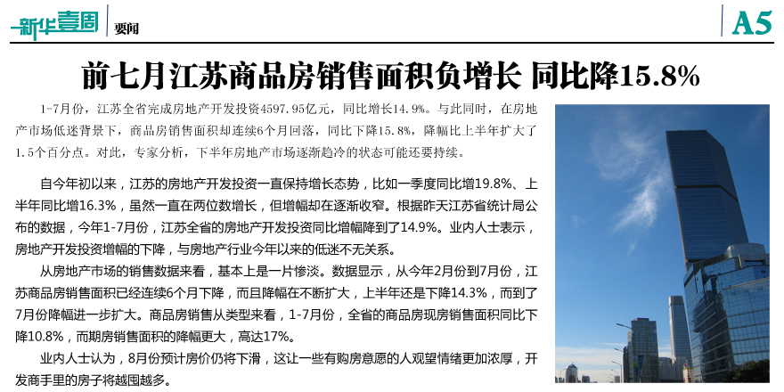 前七月江蘇商品房銷售面積負增長