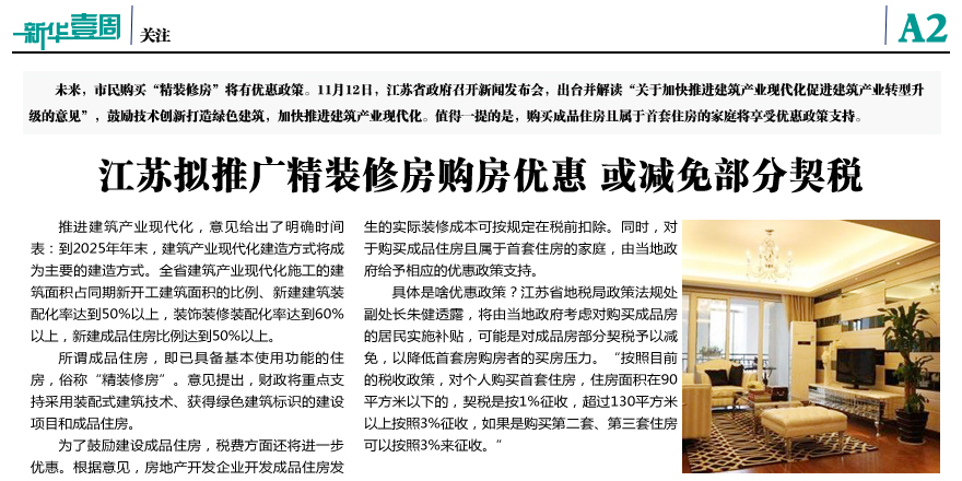 江蘇擬推廣精裝修房購(gòu)房?jī)?yōu)惠