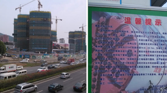 通過景田北天橋,步行約五分鐘左右,記者到達(dá)項(xiàng)目現(xiàn)場(chǎng)。在天橋上,記者看到,由于項(xiàng)目旁邊的北環(huán)大道是深圳市東西向的重要干道,車輛密集地從項(xiàng)目旁呼嘯而過。在項(xiàng)目周邊,規(guī)劃中地鐵9號(hào)線也正在施工,預(yù)計(jì)2016年建成。