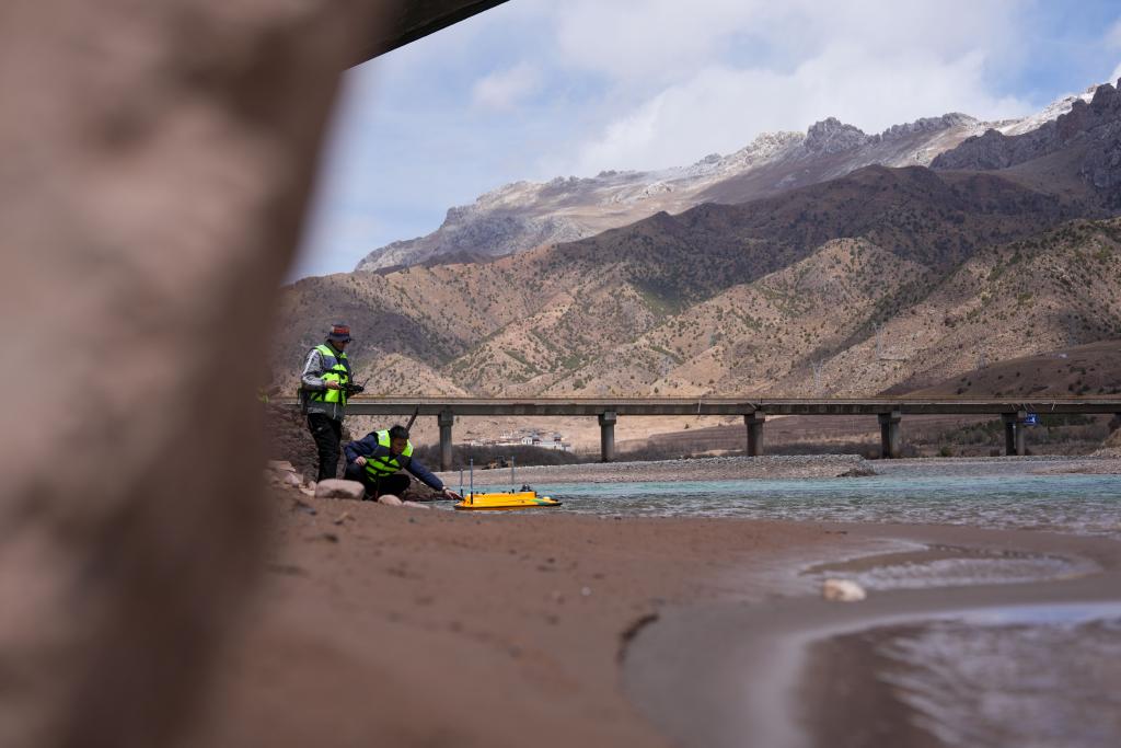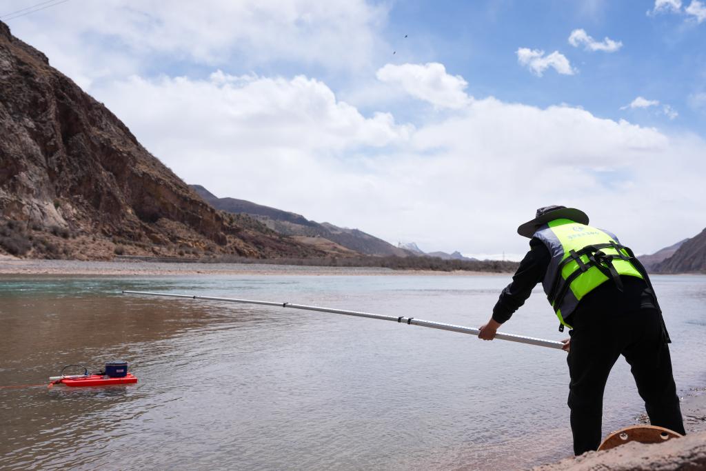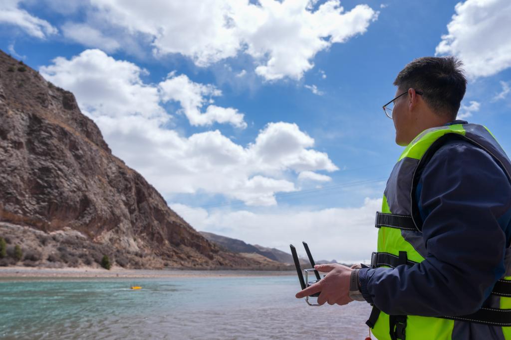 青海省玉树水文水资源测报分中心职工在香达水文站通过无人船测量水下断面。新华社发