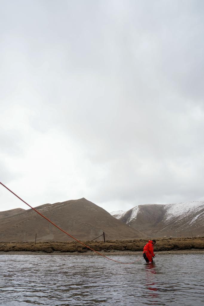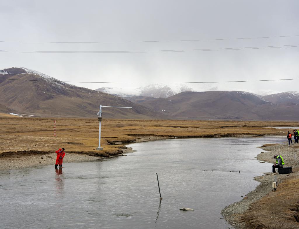 青海省玉树水文水资源测报分中心职工在隆宝滩水文站附近河流作业。新华社发