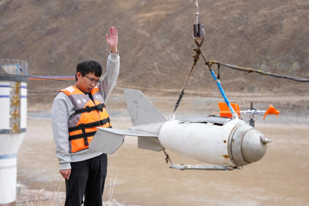 青海省玉树水文水资源测报分中心职工在直门达水文站通过铅鱼进行流量测验。新华社发