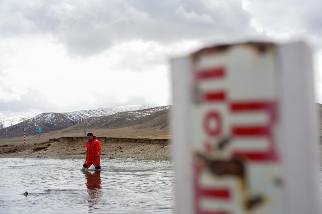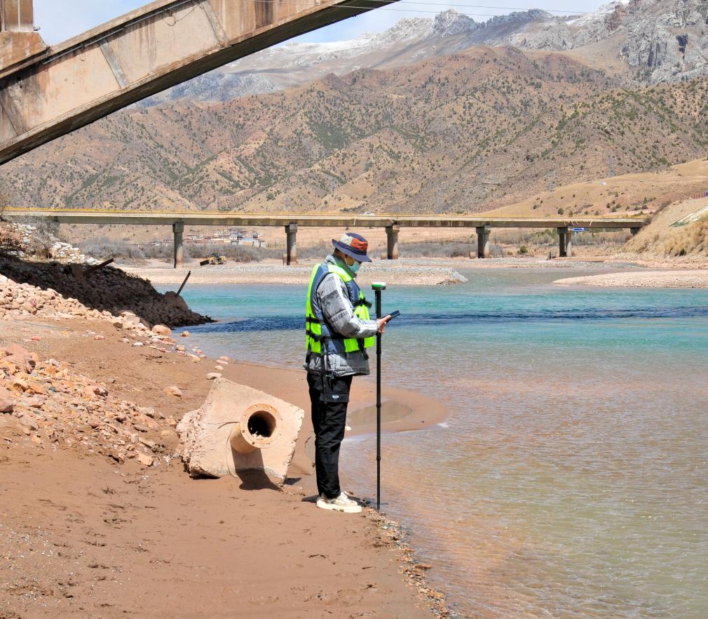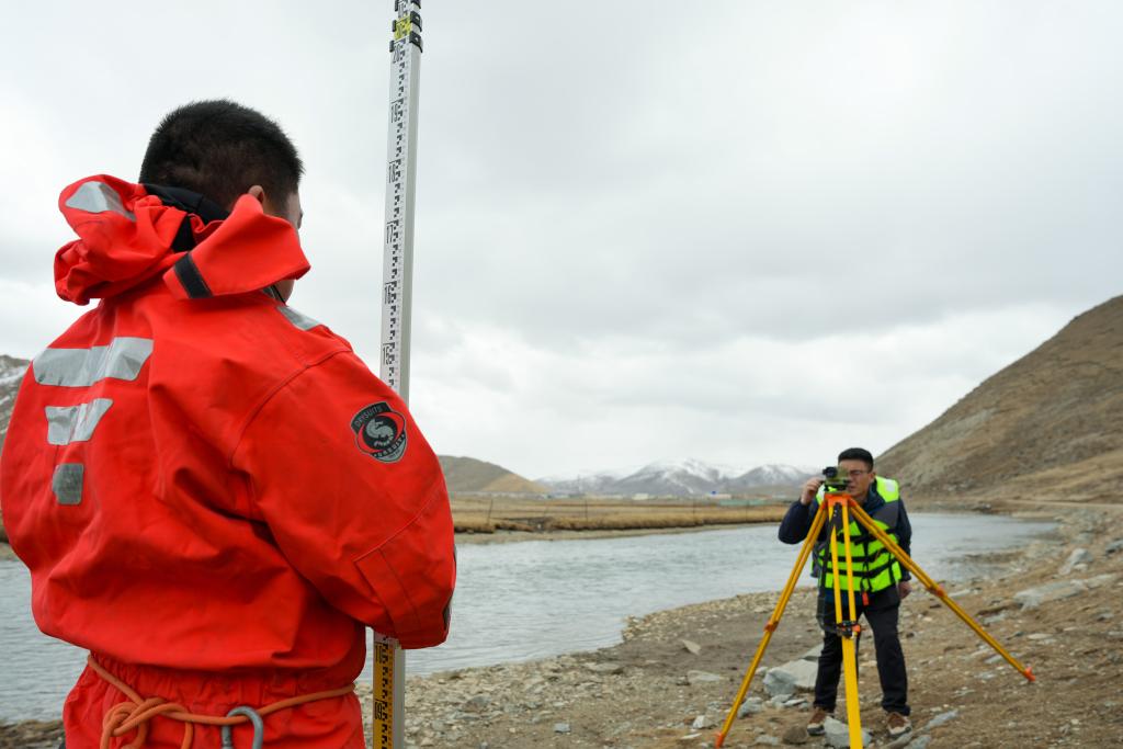 青海省玉树水文水资源测报分中心职工在隆宝滩水文站附近测量。新华社发