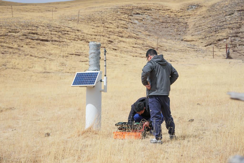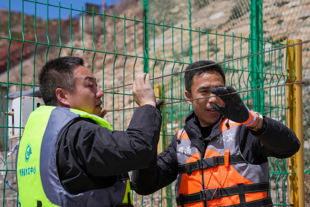 青海省玉树水文水资源测报分中心职工在香达水文站检查设备运行情况。新华社发