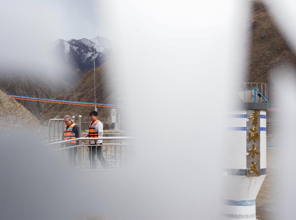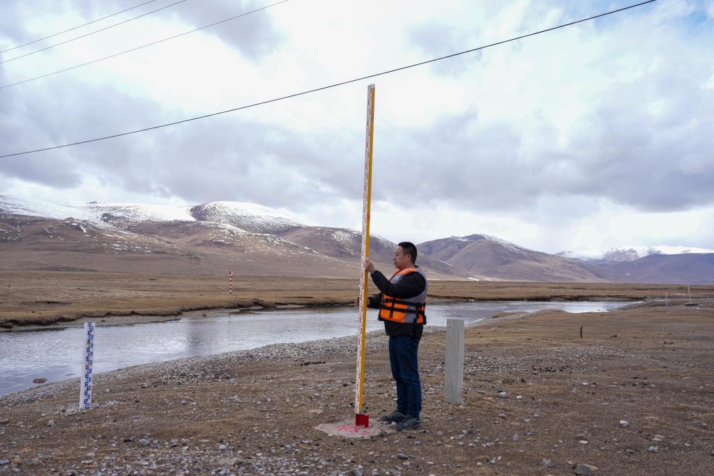 青海省玉树水文水资源测报分中心职工在隆宝滩水文站测量。新华社发