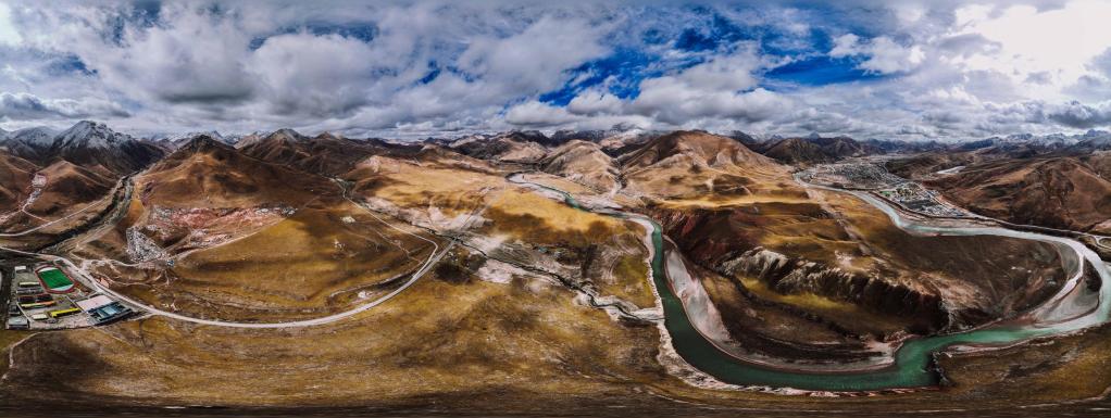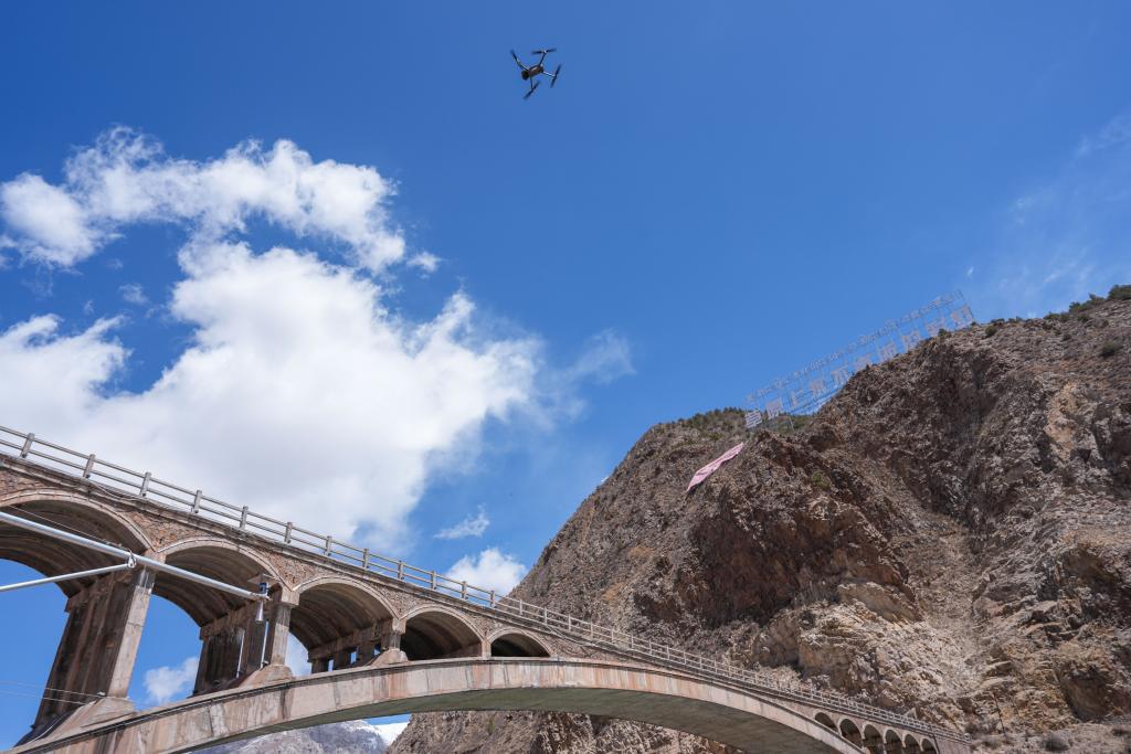 无人机正在扎曲附近测量河道周边地形。新华社发