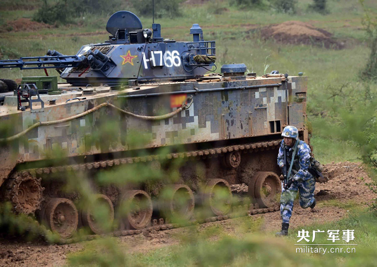 A marine runs to assault simulated targets after exiting the ZBD-05 Amphibious Infantry Fighting Vehicle (IFV) during the Exercise Jungle-2015 on Wednesday. The Marine Corps of the Chinese People’s Liberation Army (PLA) Navy kicked off a live-fire military exercise codenamed "Jungle-2015" at the Malong comprehensive training range of the PLA Chengdu Military Area Command (MAC), southwestern China's Yunnan province, on Sep. 16, 2015.