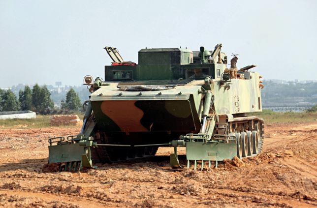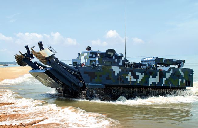????The China-made, second-generation, tracked armored vehicle carries mine ploughs, blasting devices, rocket shells and road-marking gear. It is mainly used for landing assaults by amphibious armored troops to break through anti-tank mines and obstacles. The mine ploughs can detect the position of mines, dig them up and clear the way. The blasting device in the front can destroy walls and other solid obstacles. Rocket-powered demolition mine-sweeping gear on top can fire projectiles at enemy minefields from different angles to clear a path for heavy machinery. The road-marking gear in the back of the vehicle automatically guides following forces.