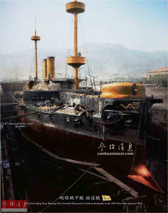 1894年,中日甲午海戰(zhàn)前夕,停泊在旅順船廠船塢進行維護的大清帝國海軍“鎮(zhèn)遠”號戰(zhàn)列艦。