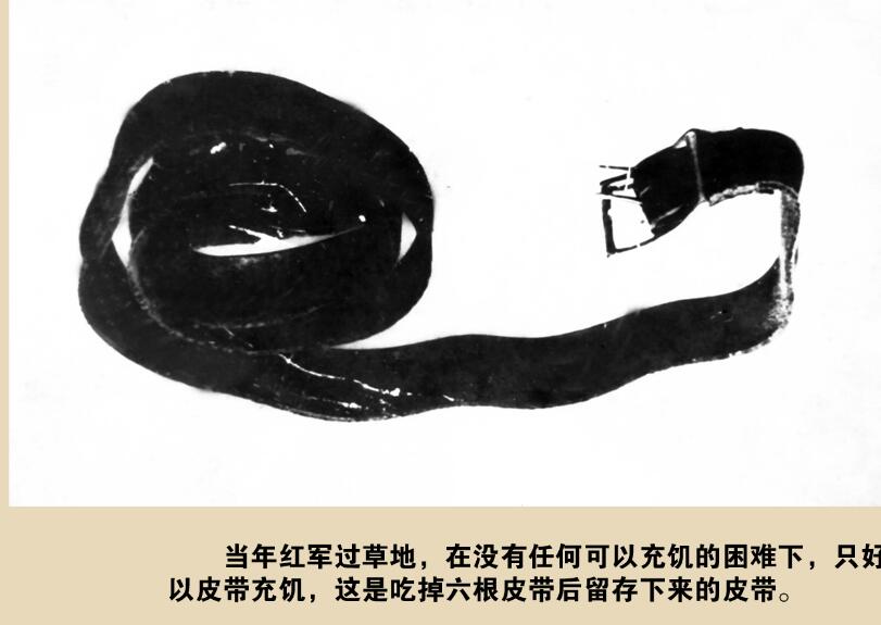 原來,這條皮帶是周廣才在1934年的一次戰(zhàn)斗中繳獲敵人的戰(zhàn)利品。但為了使全班戰(zhàn)友活下來,他只得含淚將皮帶拿出來。皮帶被切成幾段丟入滾燙的熱水中,煮熟后每人夾起“一截”狼吞虎咽的吃起來……當(dāng)鍋里還剩最后“一截”時他哭著說:“同志們,咱們留著它作個紀(jì)念吧,帶到延安去見毛主席?!睉阎鴮Ω锩鼊倮臒o限渴望,最終他們把這截皮帶留了下來。