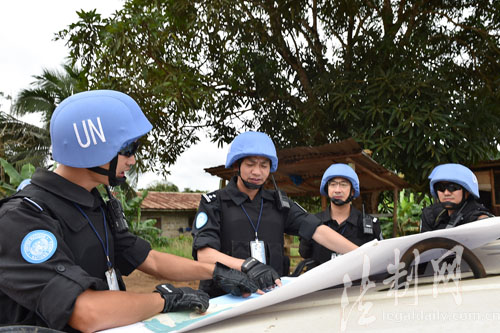 圖為防暴隊(duì)黨總支書(shū)記徐曉偉(左三)帶隊(duì)執(zhí)行利比里亞博米州武裝巡邏任務(wù)