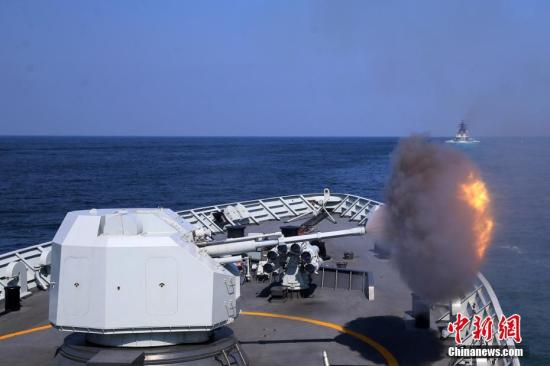 9月18日,“黃山艦”主炮開炮。當(dāng)日,中俄“海上聯(lián)合-2016”軍事演習(xí)展開實(shí)際使用武器演練。 中新社記者 韓海丹 攝