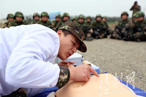 圖為在第一個休息點開展戰(zhàn)場救護科目教學