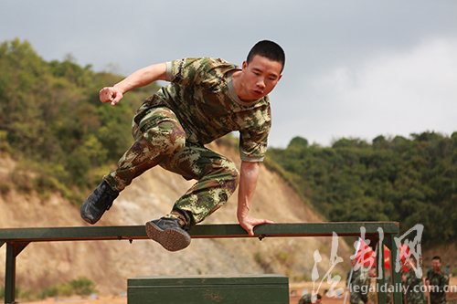 圖為大隊(duì)官兵正在快速進(jìn)行障礙跑訓(xùn)練
