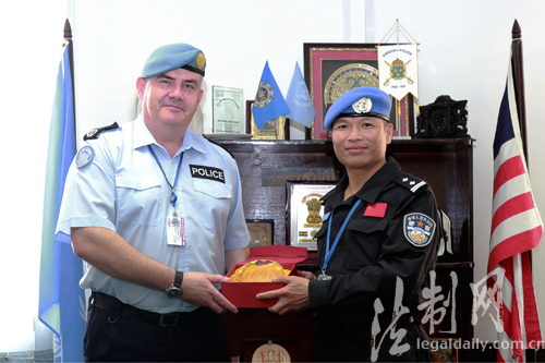????藍(lán)隊長向總警監(jiān)匯報了中國防暴隊編成、物資裝備、甄選考核以及抵達(dá)任務(wù)區(qū)后執(zhí)行維和勤務(wù)等情況,介紹了中國防暴隊在部隊正規(guī)化建設(shè)、治安形勢研判、后勤綜合保障等方面經(jīng)驗做法,并表示將恪守聯(lián)合國核心價值,堅決服從聯(lián)利團指揮鏈條,嚴(yán)格落實防暴辦下達(dá)的各項指令任務(wù),繼續(xù)保持和發(fā)揚中國維和警隊紀(jì)律嚴(yán)明、敢打硬仗的優(yōu)良傳統(tǒng)。