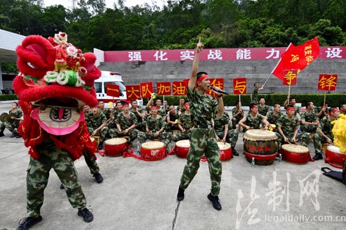 ????五月綠茵,激情無限。連日來,每到下午,深圳市銀湖山邊防訓(xùn)練基地里總是人聲鼎沸,這是廣東邊防總隊(duì)機(jī)動(dòng)支隊(duì)“和諧杯”正在如火如荼進(jìn)行。與其它足球賽不一樣的是,別的比賽屬于場上22個(gè)人,而這里的比賽卻屬于每一個(gè)人。這個(gè)支隊(duì)將娛樂賽事當(dāng)成放松身心、提神聚氣之舉,在系列賽事中設(shè)置與比賽同等重要的拉拉隊(duì)比賽,要求全民參與,除了場上比賽,裁判員同時(shí)對每支拉拉隊(duì)進(jìn)行實(shí)時(shí)評分,此舉有效的提升全民參與熱情,處處展現(xiàn)凝神聚氣爭第一的鮮活局面。