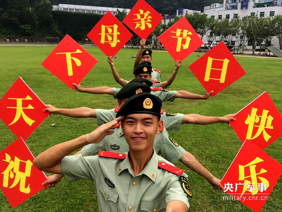 5月13日,武警廣東省邊防總隊機動支隊官兵手舉祝福語,一起為母親送上節(jié)日問候。
