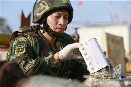 圖為邊防官兵對成品油進(jìn)行抽樣送檢