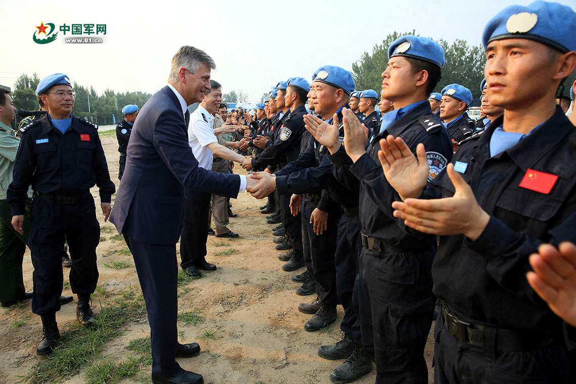 6月30日,聯(lián)合國副秘書長拉克魯瓦與常備維和警隊(duì)隊(duì)員握手。