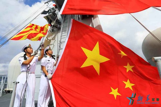 ↑遼寧艦在維多利亞灣泊后,信號(hào)兵將國旗升起。張凱 攝(據(jù)新華社客戶端)