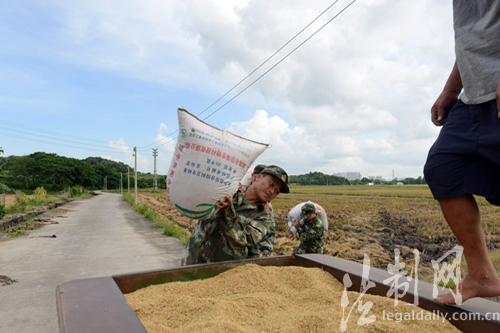 廣東中山邊防官兵走進田間地頭幫農(nóng)戶搶收稻谷