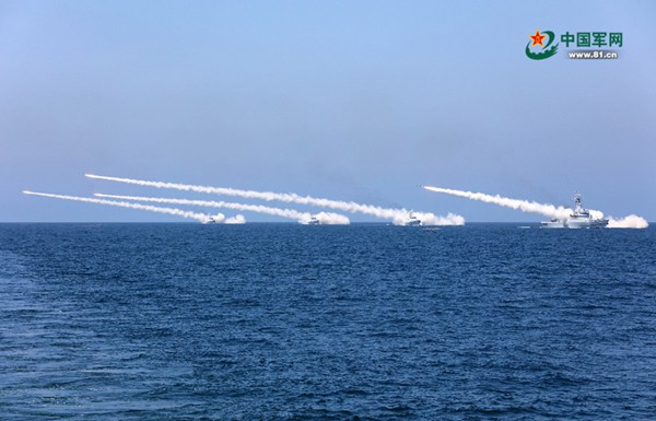 8月7日,海軍在黃海、渤海相關(guān)海空域組織實(shí)兵實(shí)彈對抗演習(xí),最大限度檢驗(yàn)體系作戰(zhàn)能力、戰(zhàn)法訓(xùn)法、武器裝備效能,共實(shí)射各型導(dǎo)彈數(shù)十枚。這是水面艦艇齊射反艦導(dǎo)彈。李唐 攝(圖片來源:中國軍網(wǎng))