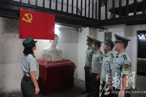 圖為貴港邊防檢查站黨員官兵在參觀革命時期地下黨員們入黨宣誓的場地和瞻仰先烈的雕像