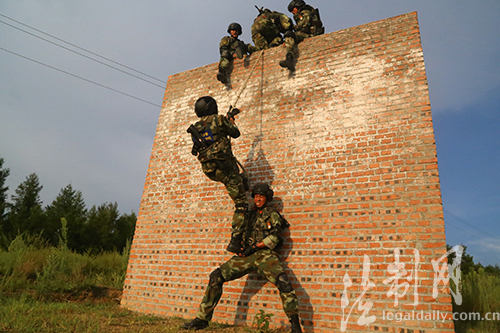 圖為特戰(zhàn)隊(duì)員在協(xié)同通過(guò)四米墻
