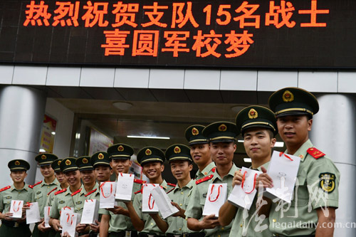 ????昔日禁毒反恐當(dāng)尖兵,今朝題名金榜站排頭!正當(dāng)各地紛紛樂道高考升學(xué)率的同時,南粵邊防警營也傳來喜報。8月28日,深圳銀湖山訓(xùn)練基地里處處洋溢著喜悅;禁毒尖兵、狙擊手、士官楊平申等來至廣東公安邊防總隊機動支隊的15名戰(zhàn)士喜圓軍校夢,被廊坊武警學(xué)院、公安邊防高等??茖W(xué)校等3所部隊院校錄取,戰(zhàn)友們?yōu)樗麄兣e行簡樸而隆重的歡送儀式。據(jù)悉,連續(xù)多年來,這個支隊在廣東邊防總隊40多個基層單位中戰(zhàn)士升學(xué)率名列前茅。