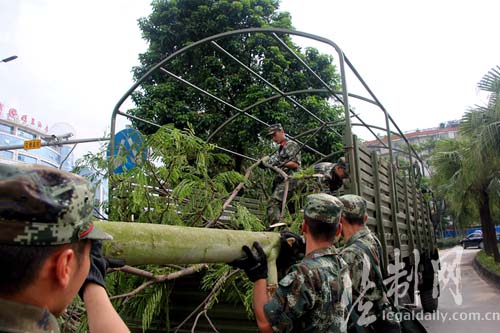????自8月23日開始,今年第13、14號臺風(fēng)“天鴿”、“帕卡”相繼在廣東沿海登陸。位于臺風(fēng)登陸途徑的廣東省江門市遭受了嚴(yán)重的破壞,市區(qū)道路兩邊大量樹木被吹倒,甚至被連根拔起。為最大限度減少臺風(fēng)帶來的損失,8月24日至8月28日,廣東邊防總隊江門邊檢站官兵積極響應(yīng)江門市委、市政府的號召,迅速動員部署,先后組織200余名官兵深入駐地受災(zāi)街道開展災(zāi)后清理工作,幫助群眾重建家園,以實際行動踐行全心全意為人民服務(wù)的宗旨,受到駐地黨政職能部門和人民群眾的一致好評。