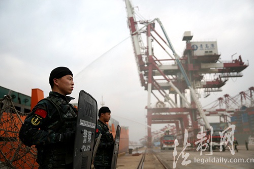 ????此次海上聯(lián)合反恐演練以阻止多名“涉恐分子”潛入港區(qū)及外輪企圖進行恐怖活動為背景,幾名“恐怖分子”駕車意圖混入油港區(qū)實施破壞,被識破后仍試圖強行進入。與此同時,前灣港集裝箱碼頭也發(fā)現(xiàn)幾名“涉恐分子”偽裝成船員,隨集裝箱貨輪進入港區(qū)實施破壞行動,并在一艘即將離港的貨輪上劫持“人質(zhì)”,企圖逃離港區(qū)。面對如此復雜的局面,公安、邊檢、海關、國檢、港口等部門接到情報預警信息后,及時啟動海上聯(lián)合反恐處突應急預案,聯(lián)合反恐指揮部及時下達指令,參加演練單位立即行動,邊檢利劍突擊隊隊員迅速登輪控制“涉恐分子”,消防部門架設水槍撲滅引燃物品,海關、海事巡邏艇在集裝箱船舶周邊海域鋪設防油污圍欄,并收繳走私涉恐物資。成功處置險情后,碼頭恢復生產(chǎn)作業(yè)。
