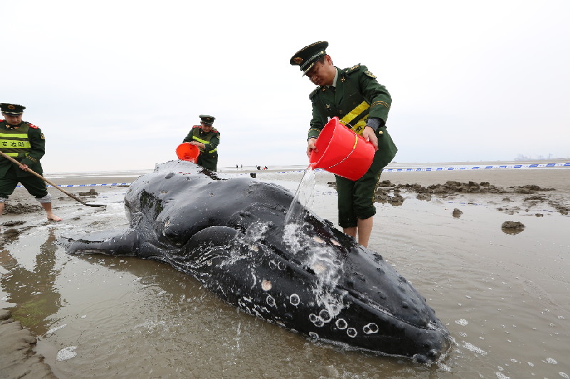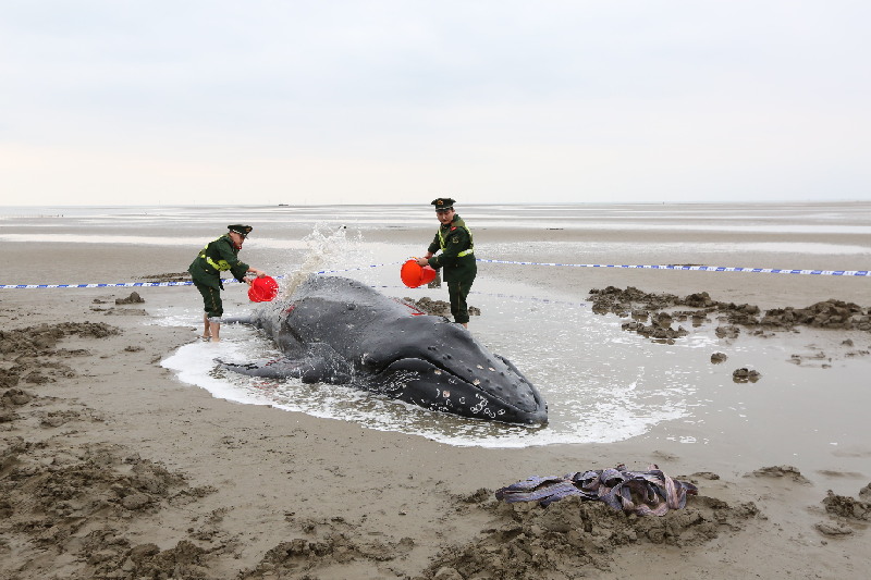 邊防官兵往座頭鯨身上澆水,維持生命體征
