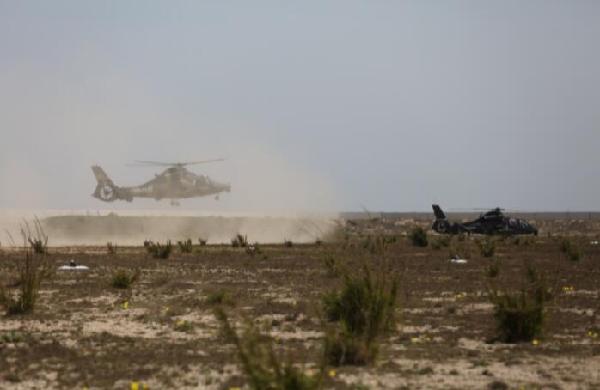 ????武裝直升機在野戰(zhàn)機場帶彈起飛(4月18日攝)。
