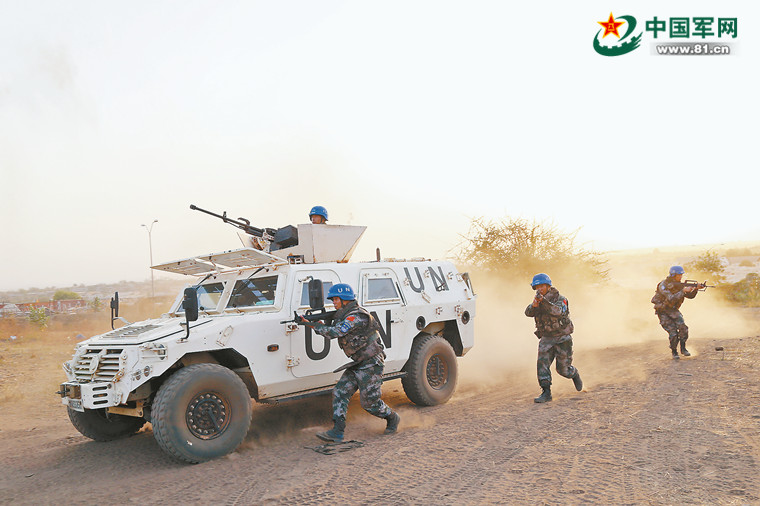 中國(guó)第4批赴南蘇丹維和步兵營(yíng)官兵舉行應(yīng)急演練。王岸鴻 攝