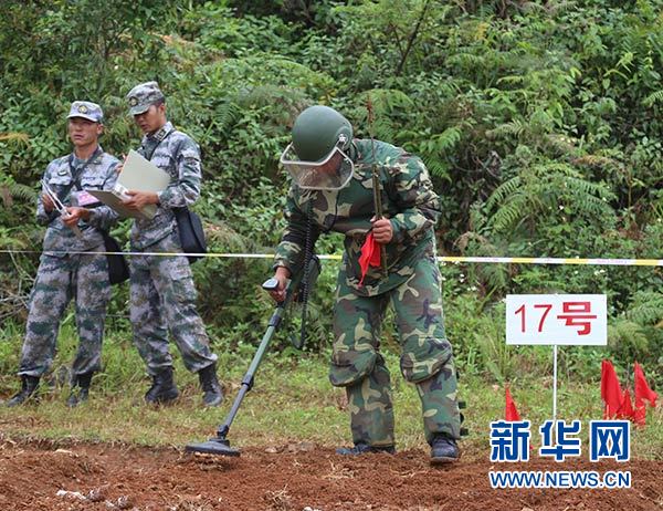 參訓(xùn)官兵到中越邊境麻栗坡某雷場參觀識別已搜排出的地雷及爆炸物(8月26日攝)。 新華社發(fā)(張輝 攝)